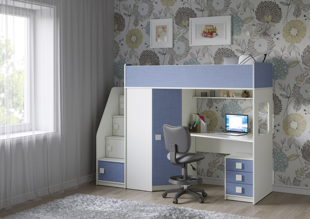 Учебная зона со столом под спальным местом открывает возможности для письменных работ, а также здесь удобно расположить ноутбук. Тумба Л-04 обеспечит хранеие канцелярских принадлежностей и учебников.