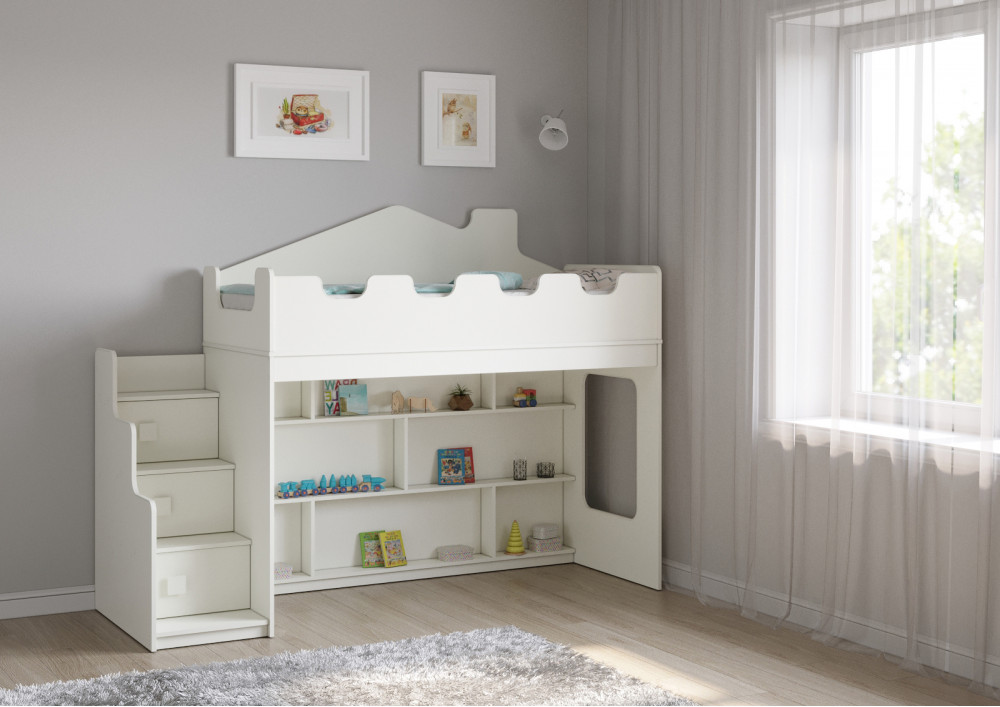 Угловая лестница с тремя дверцами обеспечивает комфортный и безопасный подъем к спальному месту и дополнительные места хранения. Вместительный стеллаж под кроватью предоставляет дополнительное пространство для хранения различных предметов и игрушек.
